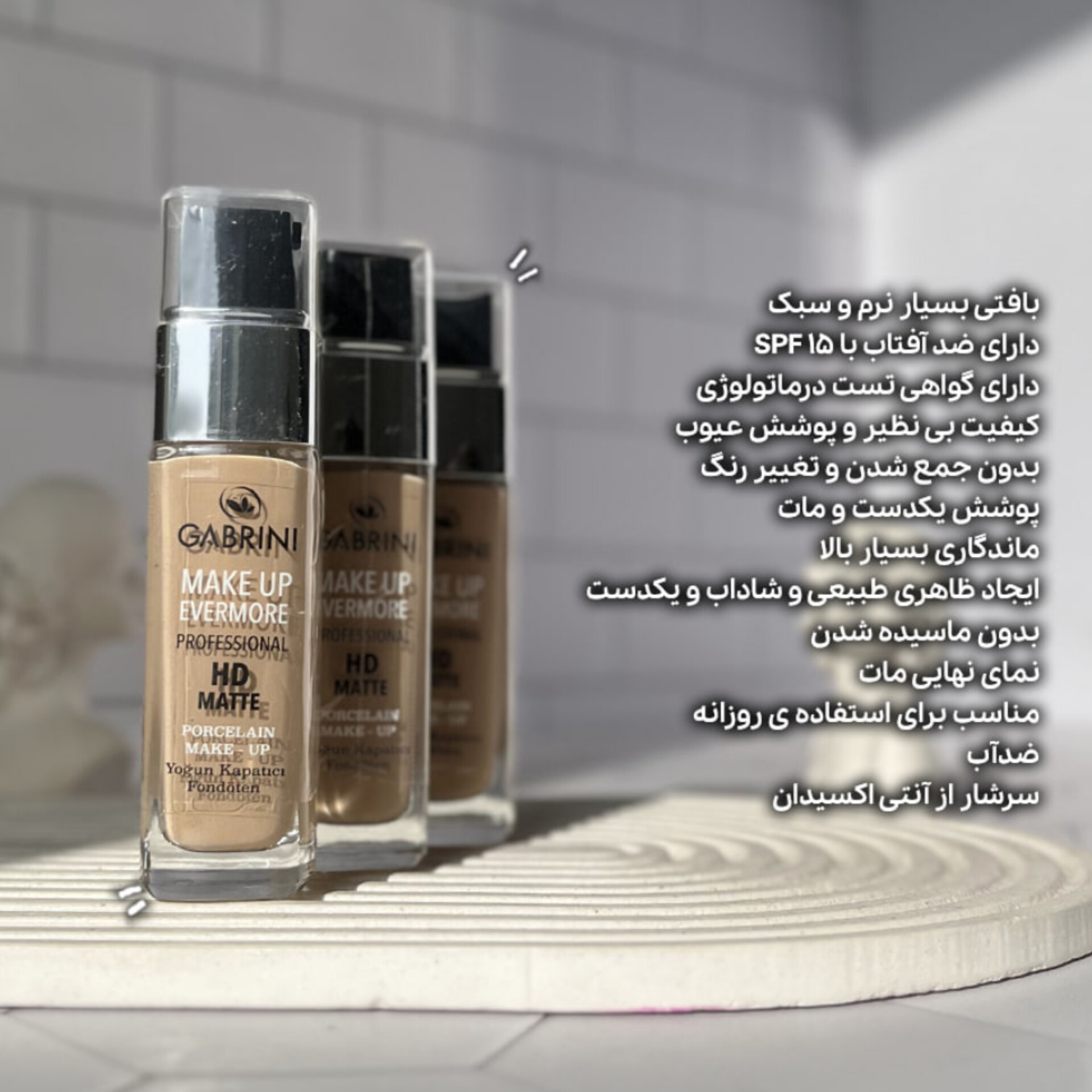 ویژگی اصلی : پوشش بالا (HD)، جلوه مات، ماندگاری طولانی، کنترل چربی، بافت سبک، غیر چرب